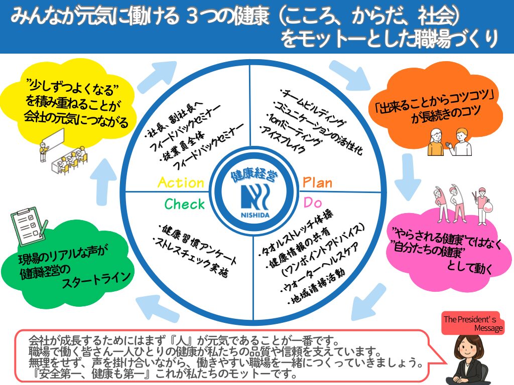 西田製作所式健康経営サイクルが決定しました。 2025.10.09 お知らせ健康経営 西田製作所式、健康経営サイクルが決まりましたので、ご報告させていただきます! こちらを元に、スタッフが自ら意見を出し合って継続や、新たなことを考えて行っていきたいと思います😊 社長のお言葉にもある通り、安全第一、健康も第一で長く働けるようにみんなでがんばりましょう!!🥳