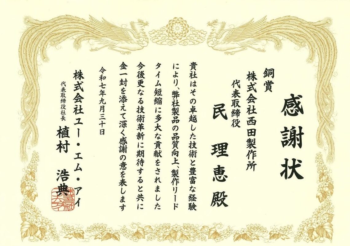 株式会社UMI様より感謝状を頂戴いたしました。 2025.10.21 お知らせ認証・認定・表彰 本年度も株式会社ユーエムアイ様より感謝状を頂戴いたしました! 去年に引き続き弊社を選んでご注文いただきたいへん感謝しております! 今後もご期待に添えるよう精進して参ります😄引き続きどうぞよろしくお願いいたします😊
